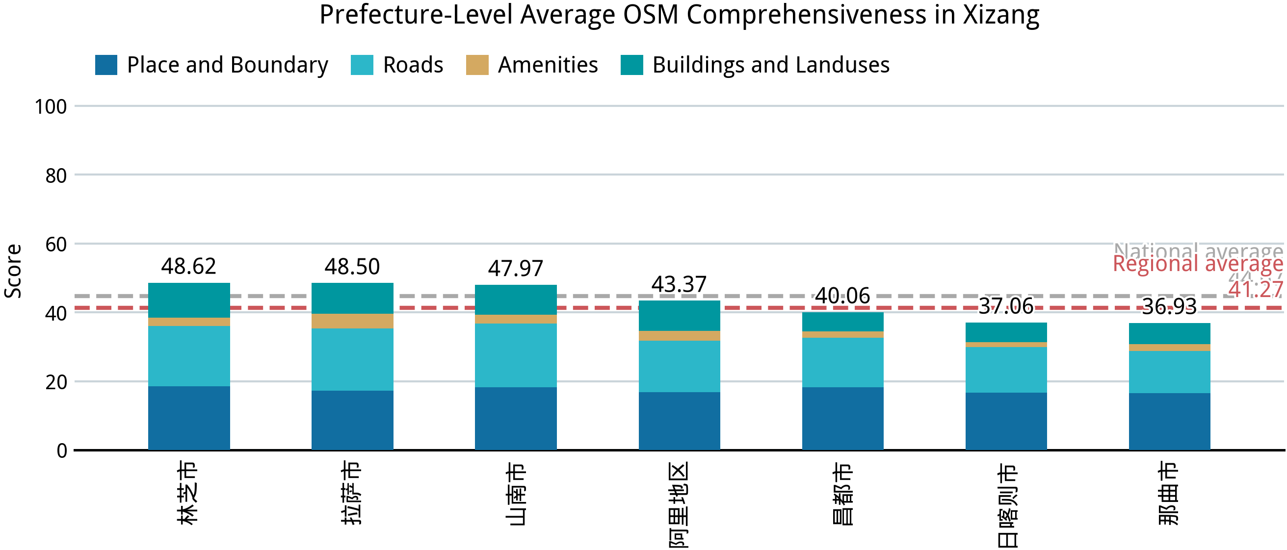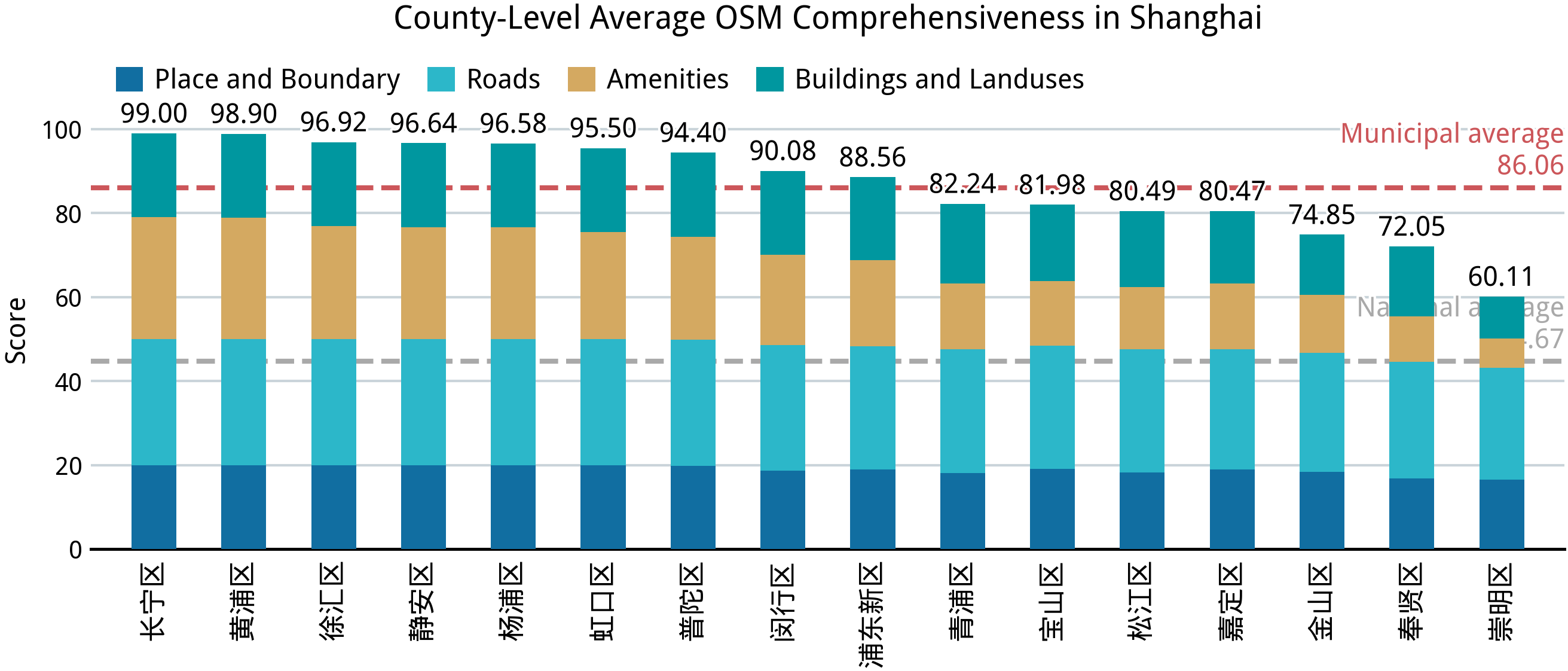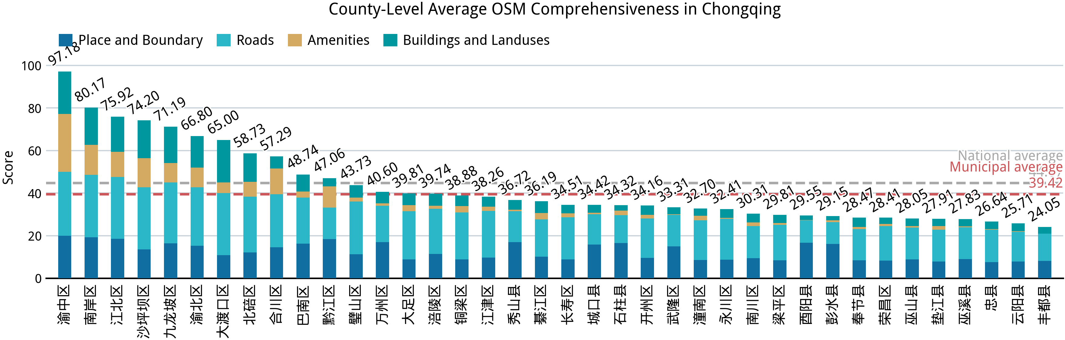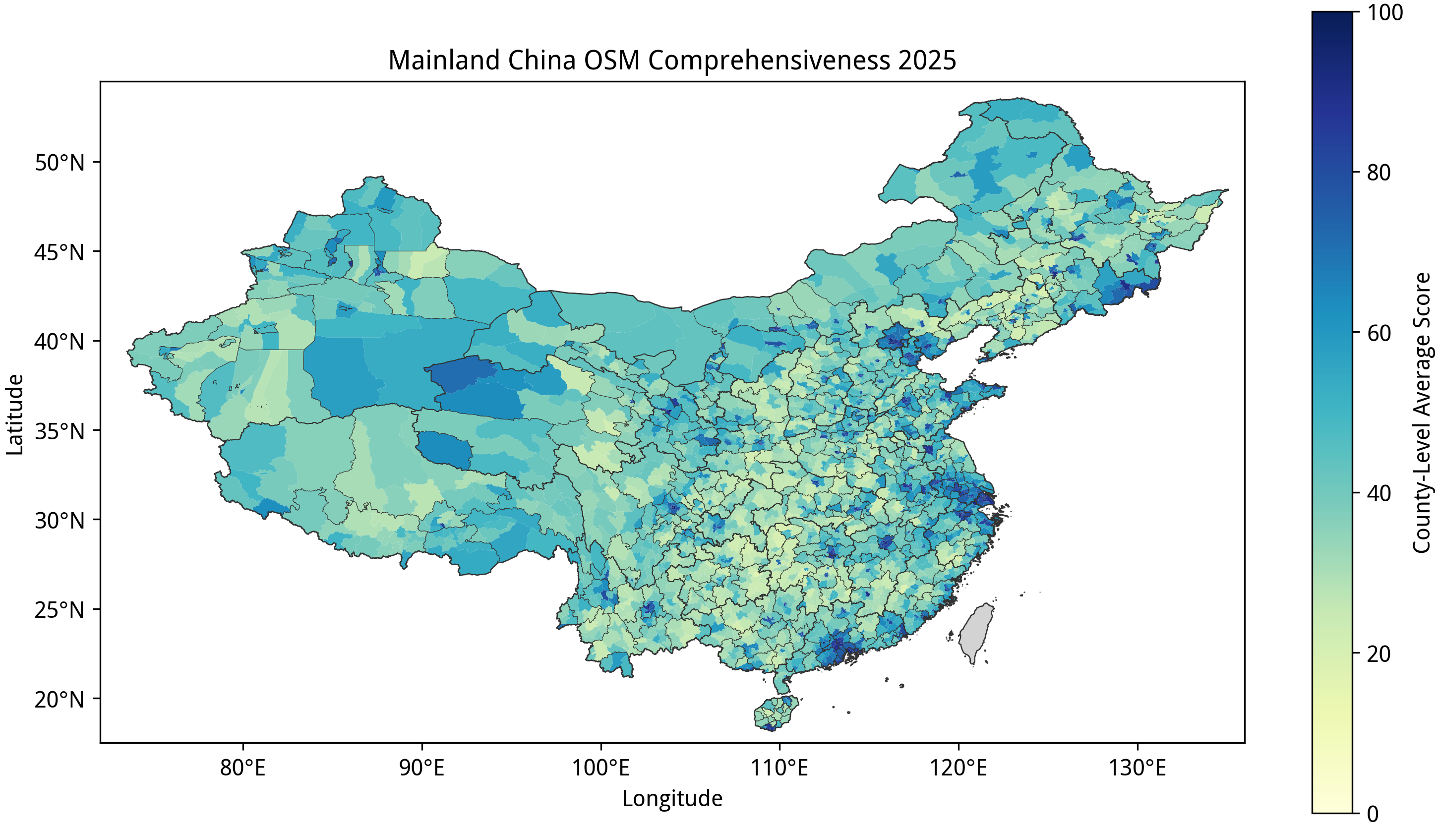 在完成中国大陆 31 个省、区、市的完备度分析之后,我们再来回答第一部分的几个问题:中国大陆的乡镇“空白”到了什么程度?在这方面,我们已经能够得出一个定量的答案。在并不算高的完备标准之下,全国依然仅有不到 2.0% 的乡级行政区能达到接近满分的标准,全体样本的平均得分则仅 44.67;绝大部分城市建成区外的乡级行政区的完备度得分都在 24–36 之间,这意味着几乎仅有节点、道路和少量用地要素被绘制在 OSM 中。