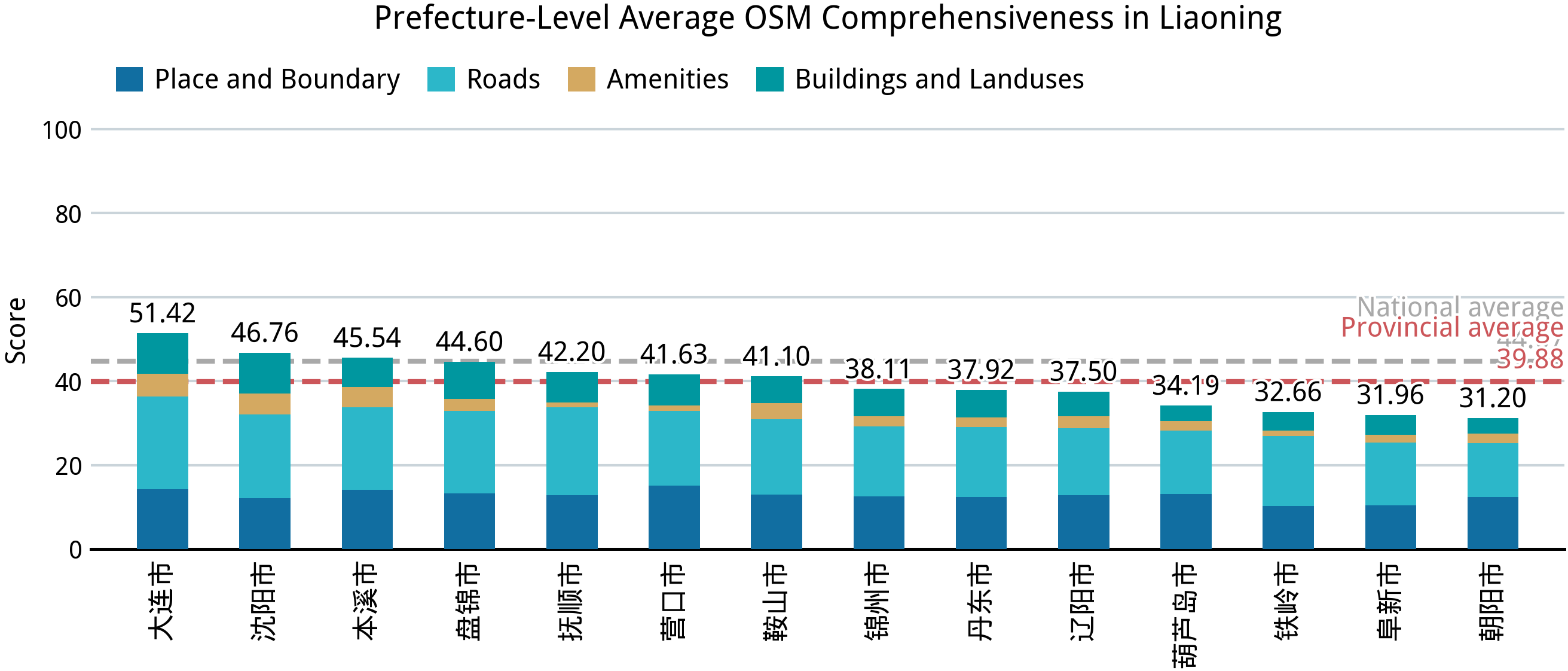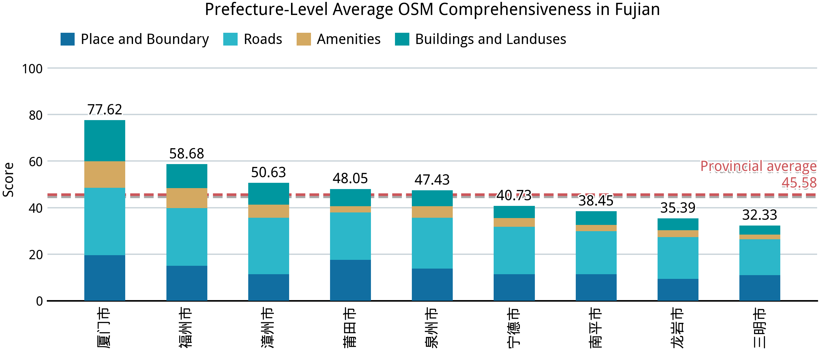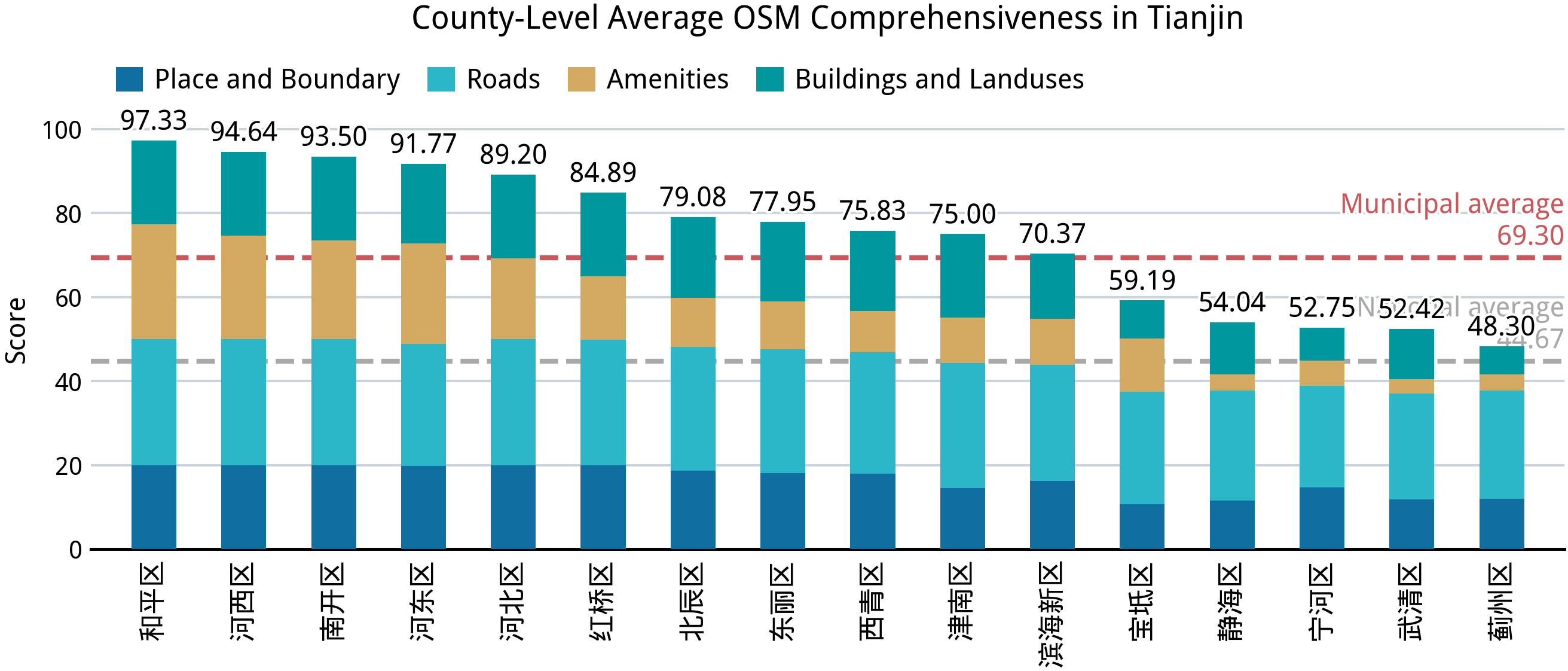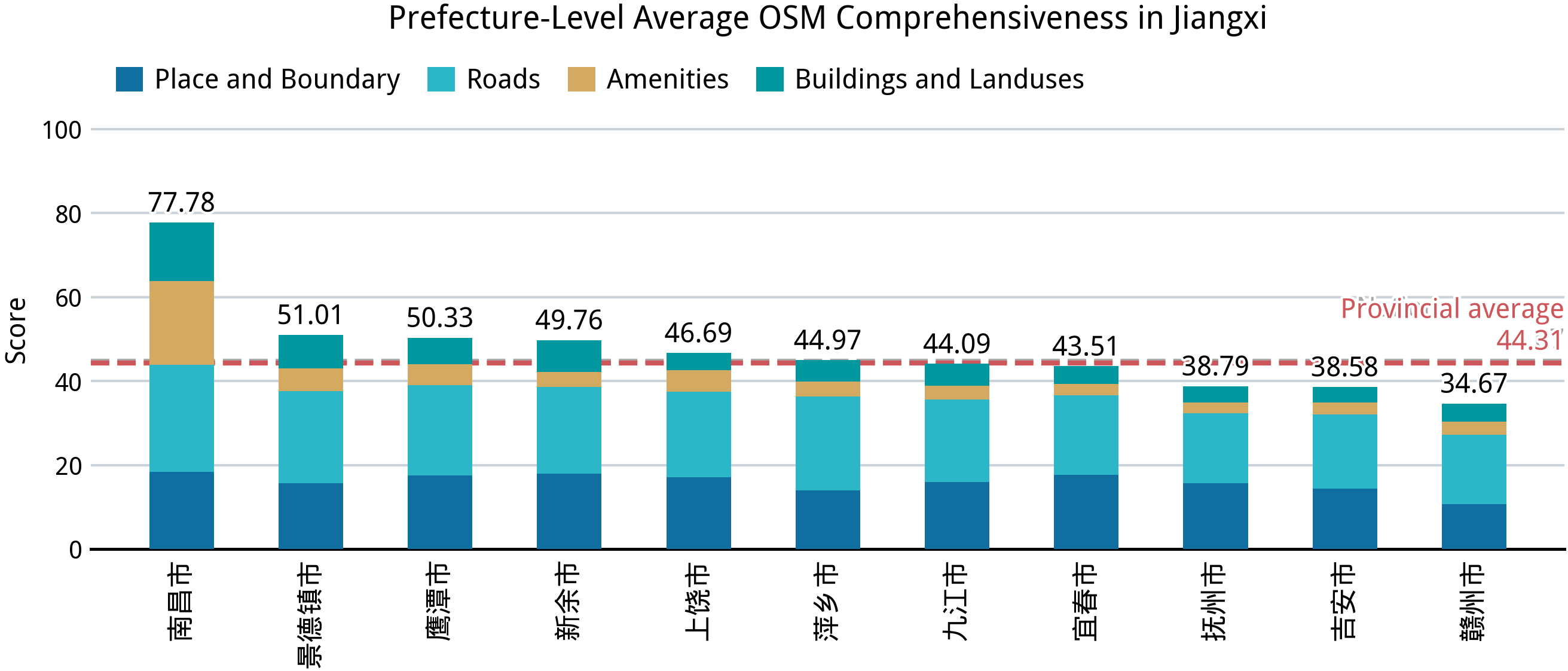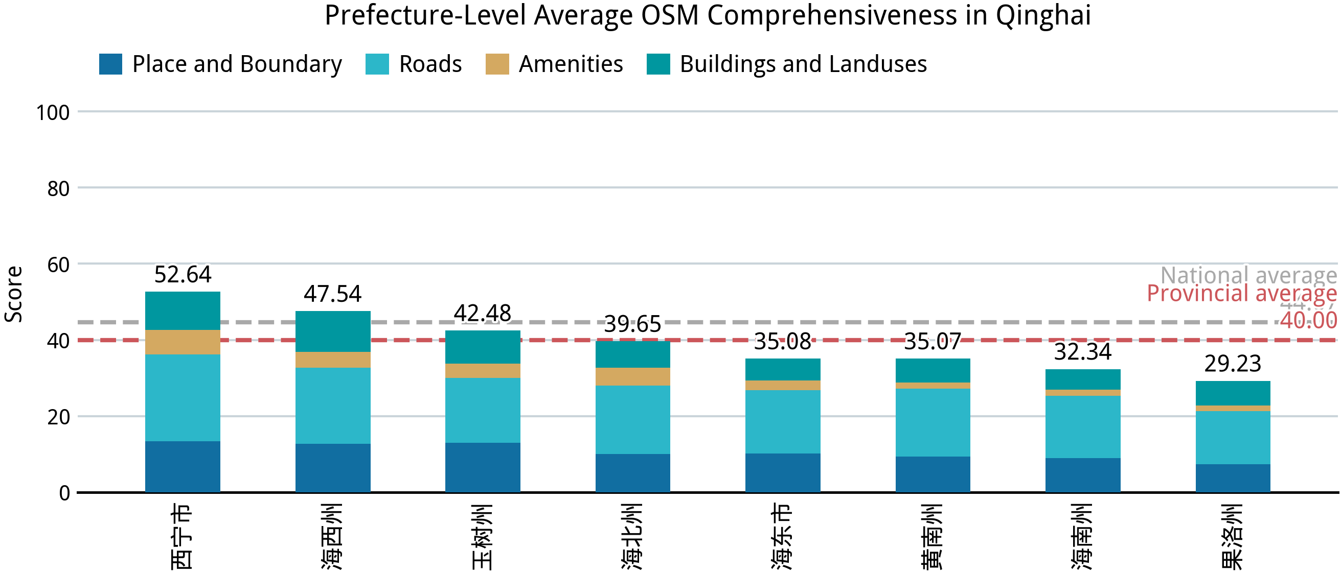 在完成中国大陆 31 个省、区、市的完备度分析之后,我们再来回答第一部分的几个问题:中国大陆的乡镇“空白”到了什么程度?在这方面,我们已经能够得出一个定量的答案。在并不算高的完备标准之下,全国依然仅有不到 2.0% 的乡级行政区能达到接近满分的标准,全体样本的平均得分则仅 44.67;绝大部分城市建成区外的乡级行政区的完备度得分都在 24–36 之间,这意味着几乎仅有节点、道路和少量用地要素被绘制在 OSM 中。