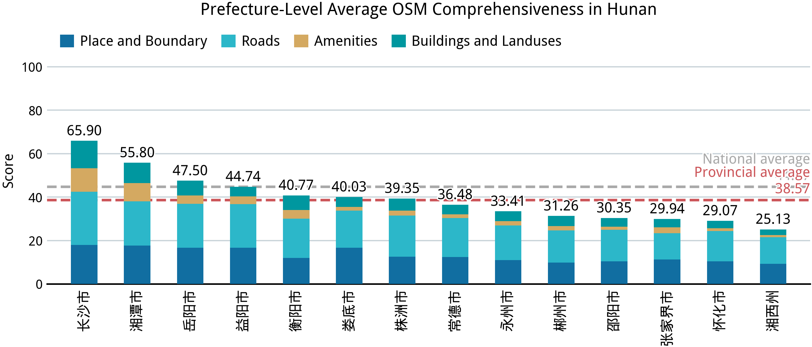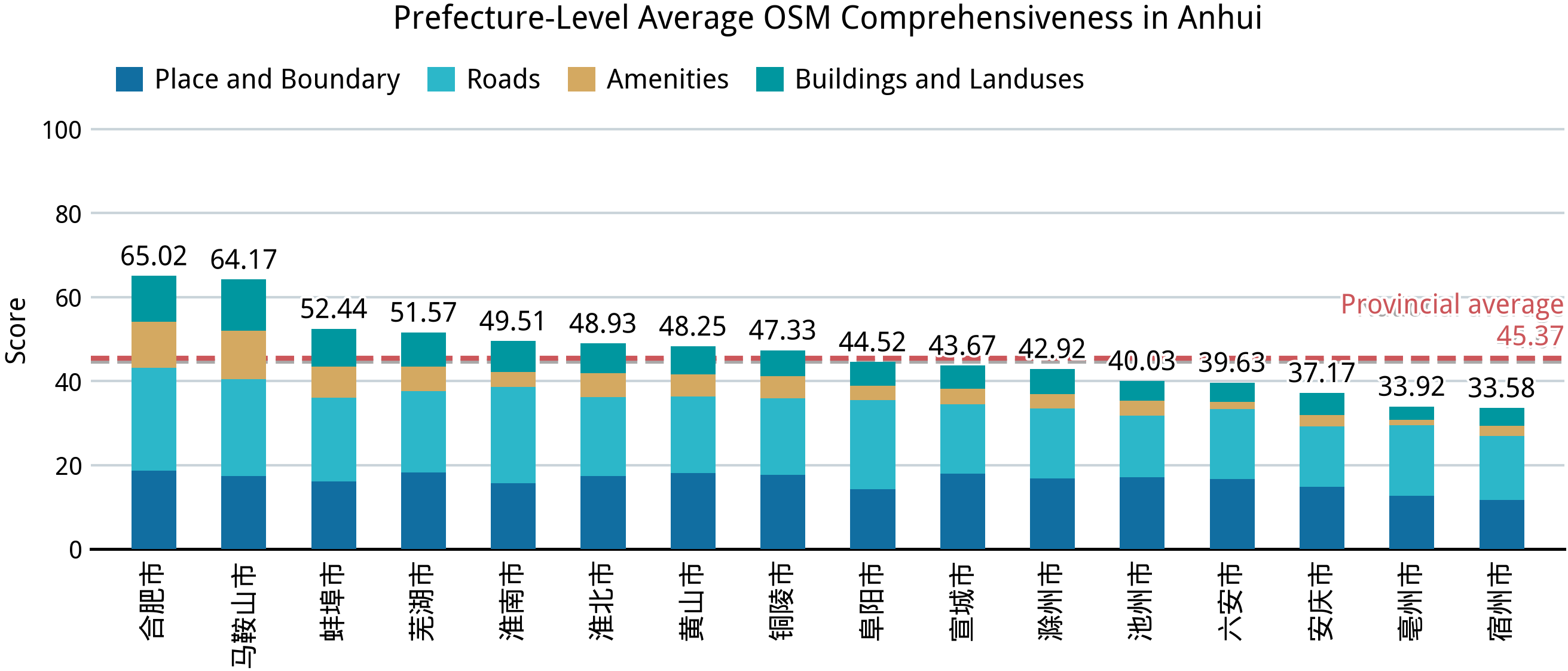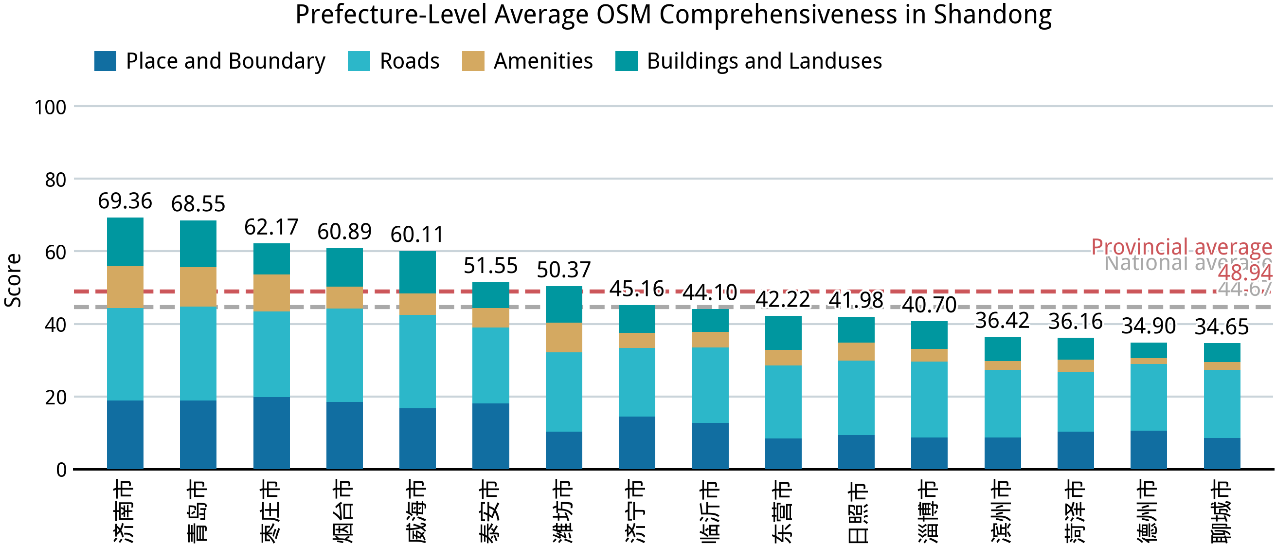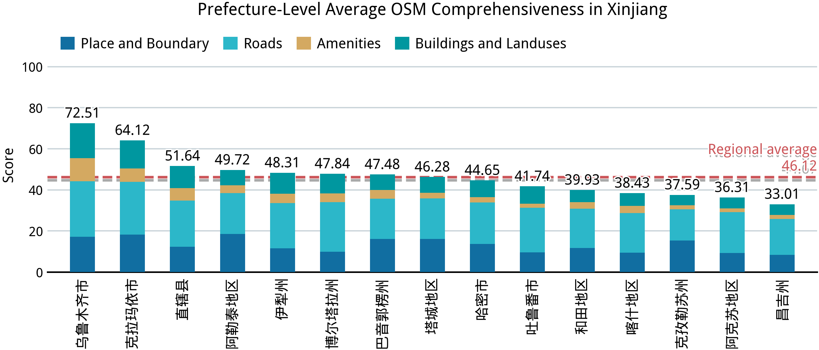 在完成中国大陆 31 个省、区、市的完备度分析之后,我们再来回答第一部分的几个问题:中国大陆的乡镇“空白”到了什么程度?在这方面,我们已经能够得出一个定量的答案。在并不算高的完备标准之下,全国依然仅有不到 2.0% 的乡级行政区能达到接近满分的标准,全体样本的平均得分则仅 44.67;绝大部分城市建成区外的乡级行政区的完备度得分都在 24–36 之间,这意味着几乎仅有节点、道路和少量用地要素被绘制在 OSM 中。