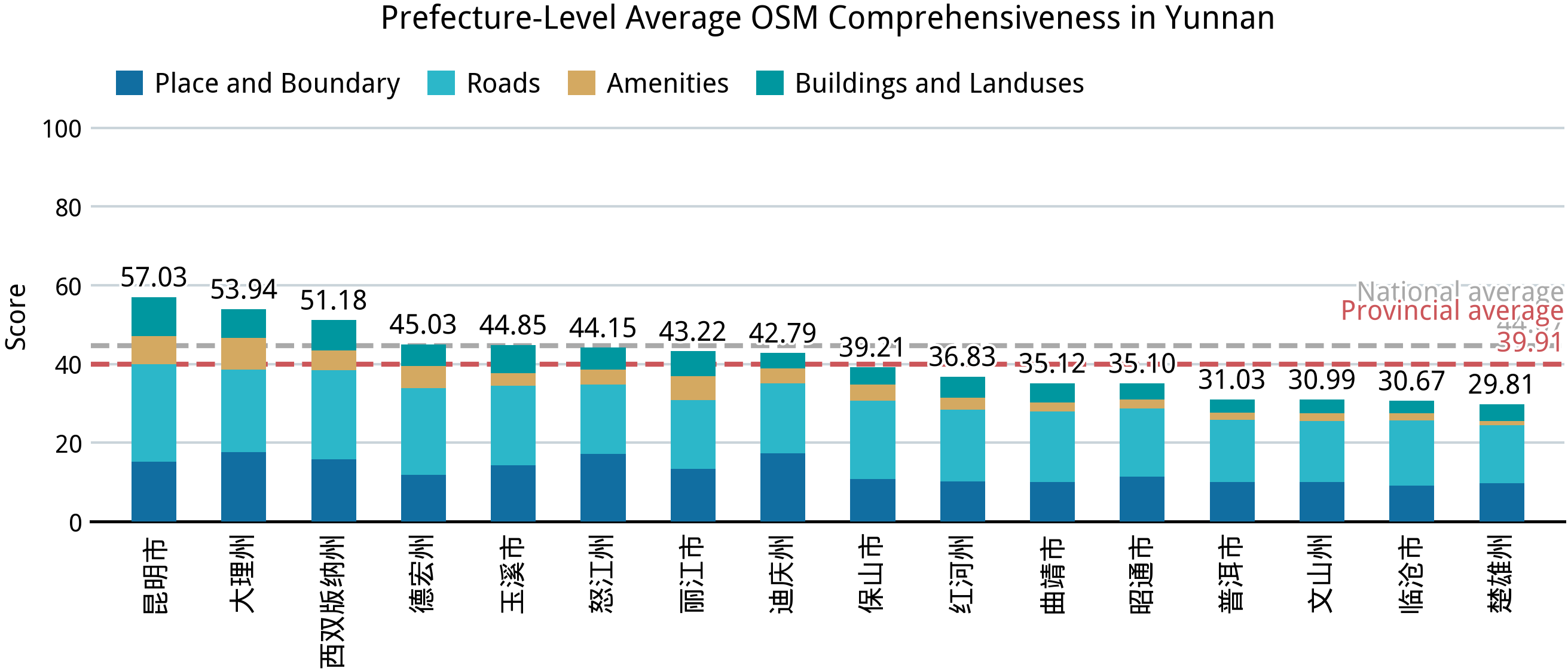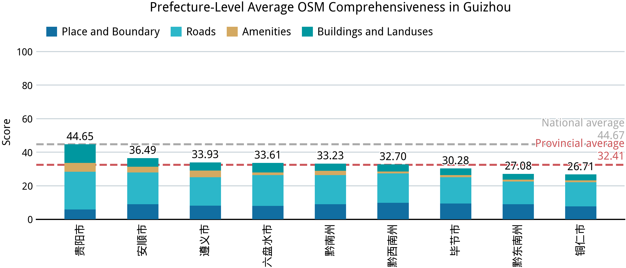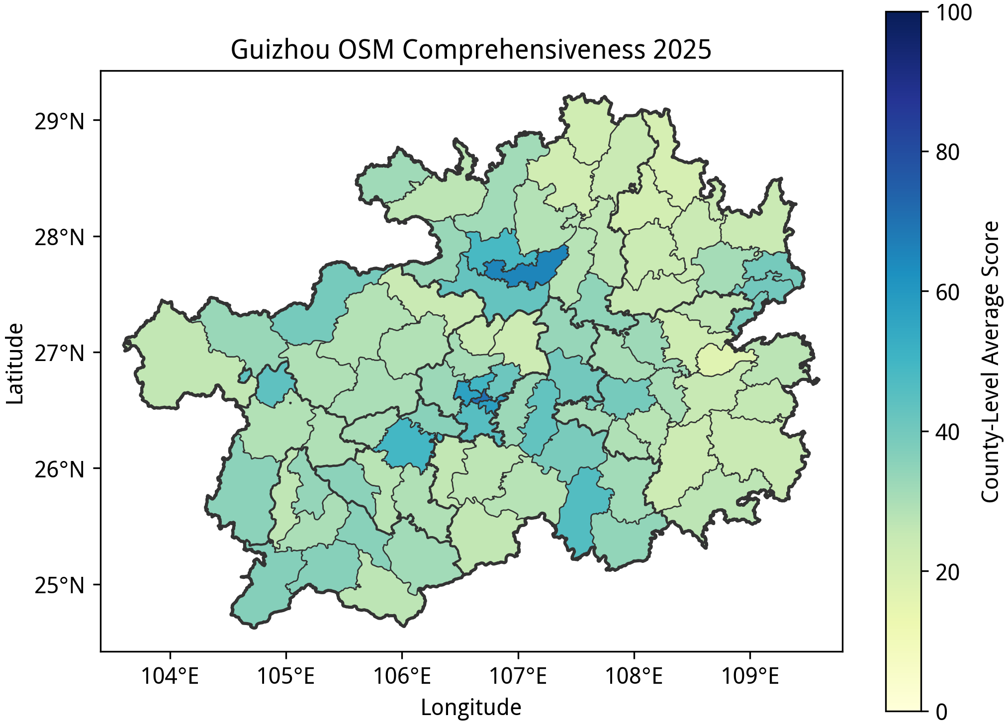 贵州不出意料地在完备度方面位列全国倒一,而且离倒数第二的陕西有 6 分的差距。最主要的原因是,贵州的省会城市贵阳的平均完备程度堪堪与其他省份的普通地级市相当,这使得贵州没有平均完备度高于 71 的县级行政单位,完全无法撑起全省的平均分。其中一个细节是,贵州市区内几乎没有标注任何的街道,这使其在行政节点和边界方面的分数甚至成为了全省倒一。