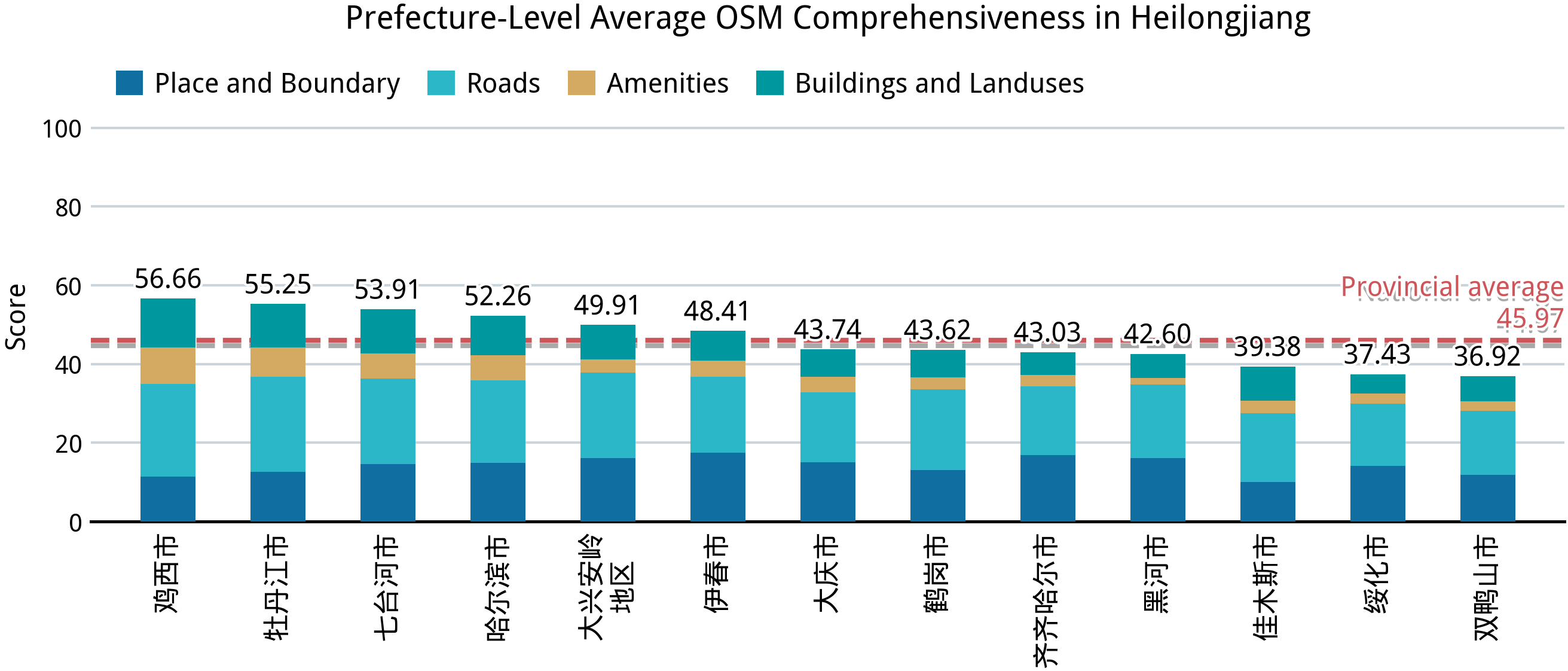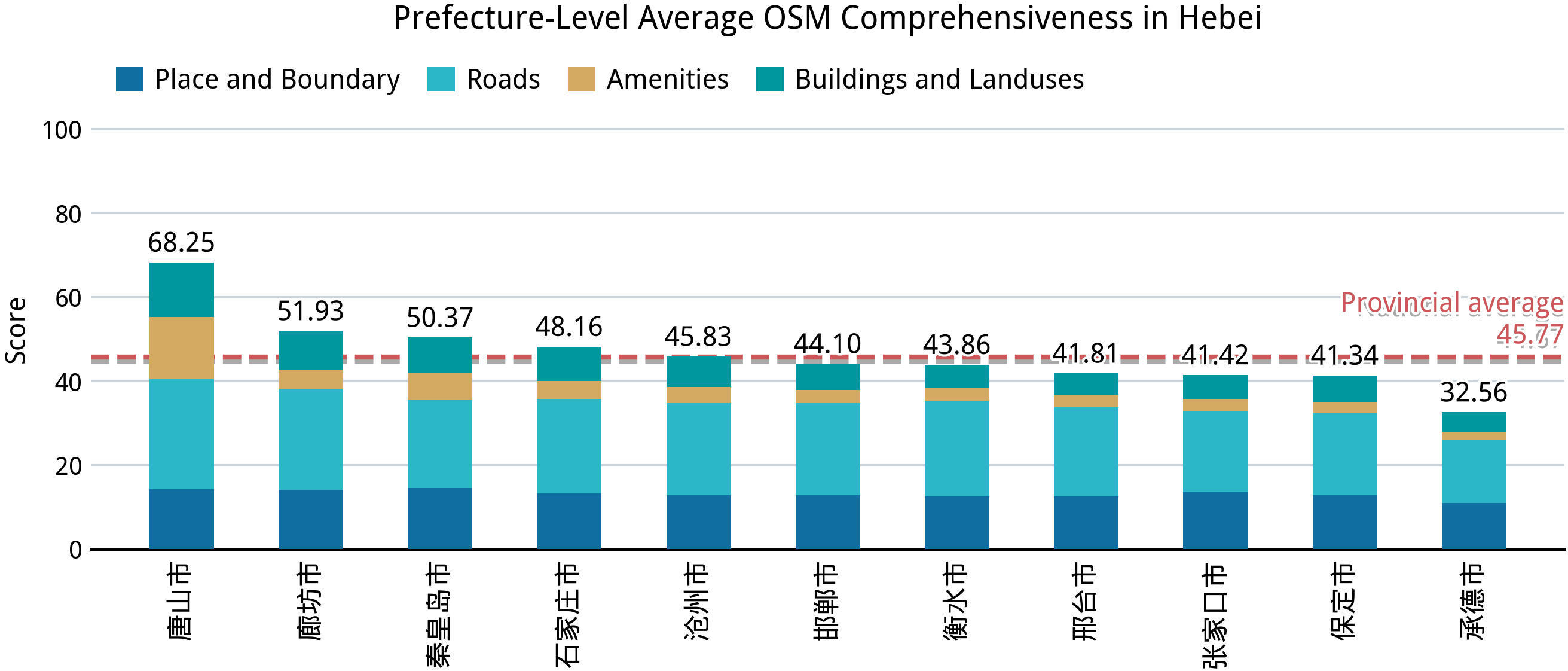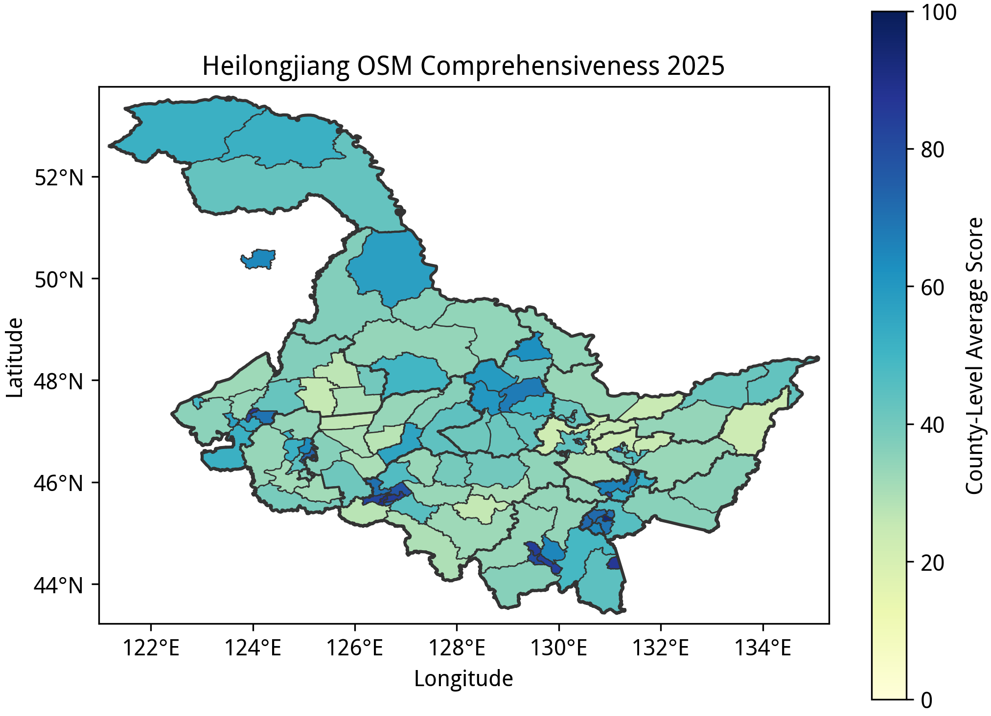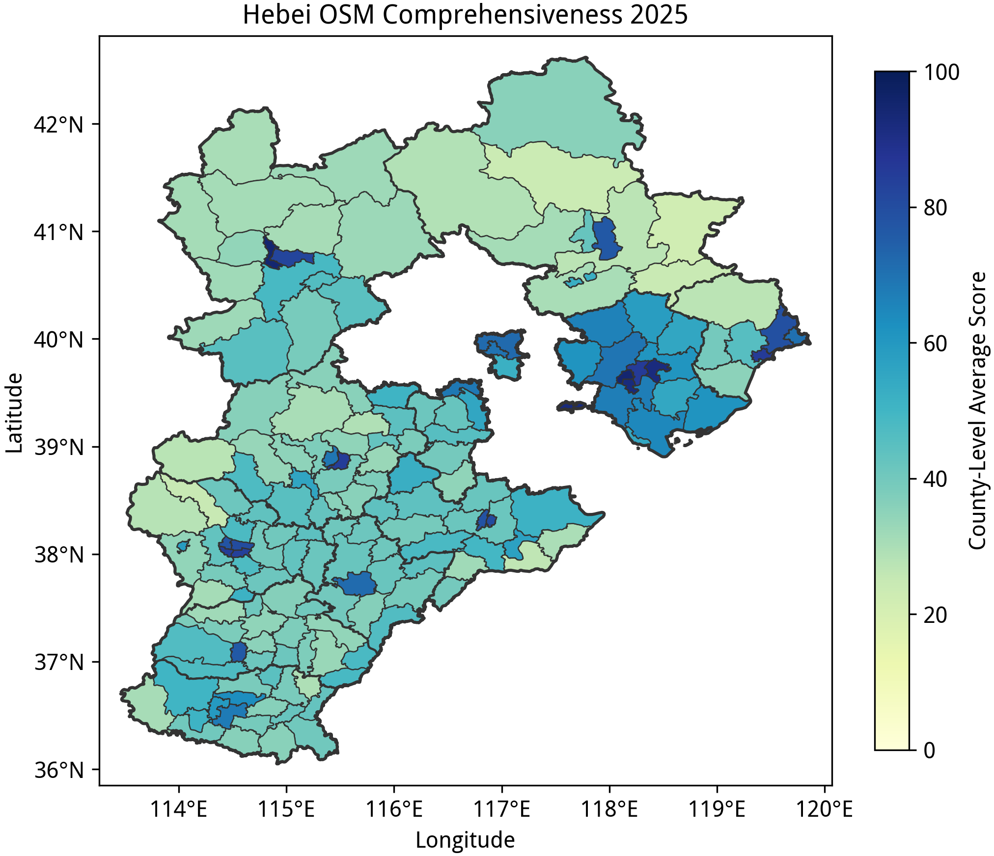 从这一部分开始,平均完备度在 40 以下的“空白”区域也在地图上变得明显,例如山东的中部和黄河沿岸各市、黑龙江的绥化、佳木斯和双鸭山,以及河北的承德、张家口(相较于其他省份,石家庄在 OSM 里确实没有什么作为省会存在感)。