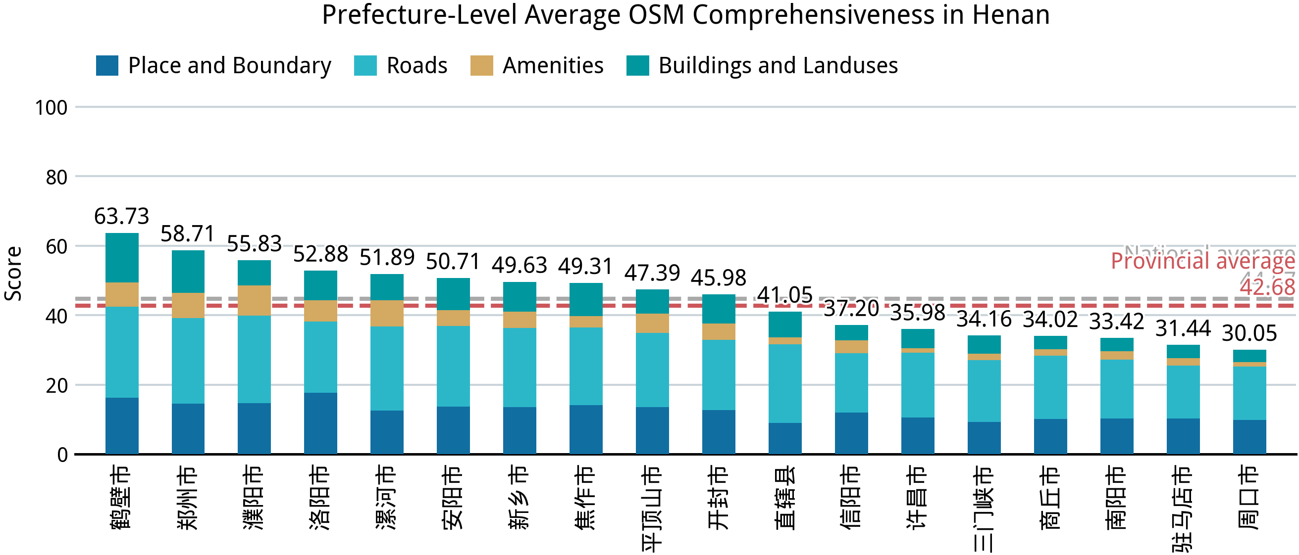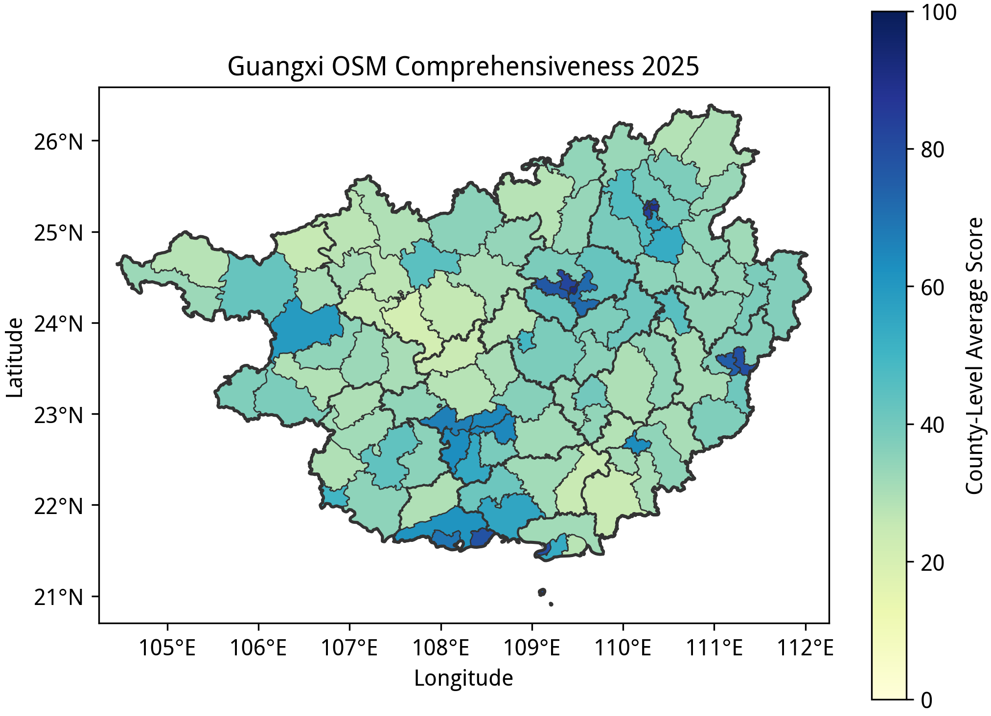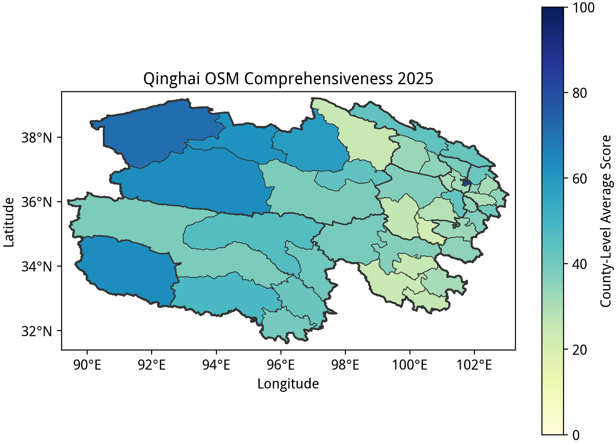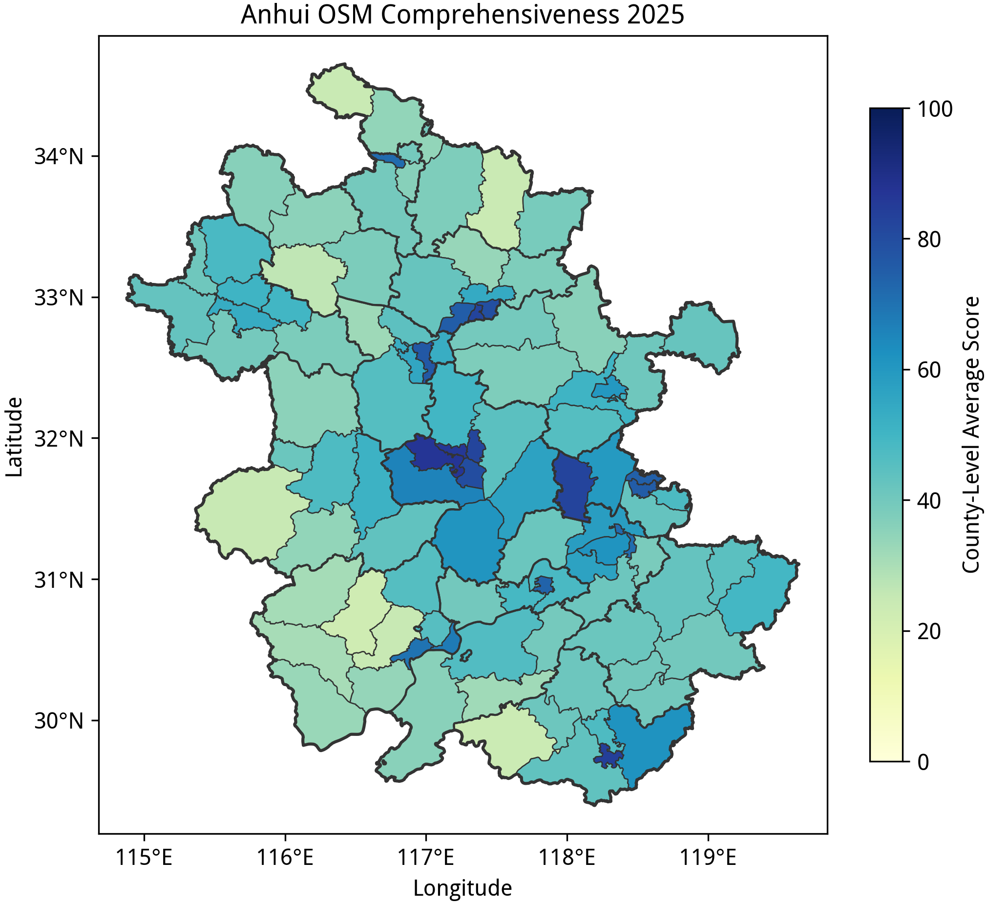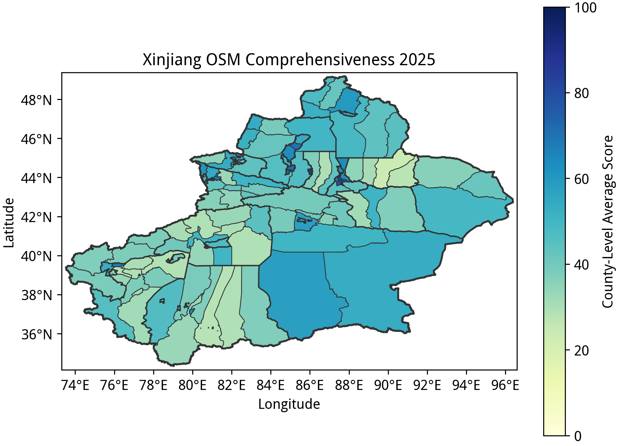 本文绘图时使用的行政边界来自于中国国家地理信息平台,与 OSM 的绘图标准会有所差异,仅作参考;平台数据的时效推测是在 2019 年前;在展示县级行政单位的平均完备度时,拆分后新设立的行政区(如杭州市钱塘区)的数据会被映射到拆分前的行政区上,而县区级黑区则因缺少相应的行政边界而无法展示