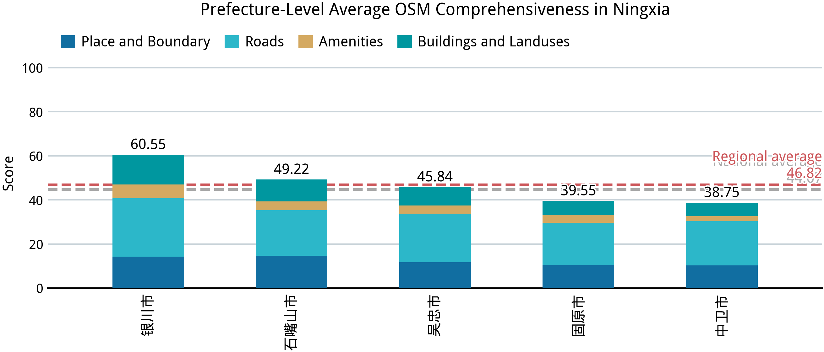 接下来的问题则是:哪些要素的缺失情况最少,哪些要素的缺失情况更加严重?这个答案相信符合大家的直观感受:行政关系和道路的缺失情况最少,公共和商业设施的缺失情况最为严重。按照满分标准,全国有 27% 的乡级行政区有完整的行政关系,有 21% 的乡镇中心有接近满分标准的道路和交通设施,有 17% 的乡镇中心有较为充足的建筑和用地类型,但仅有不到 3% 的乡镇中心标注有足够的公共和商业设施;相对地,按照零分标准,大部分乡镇在其他标准下多多少少都有一些得分,真正的“一片空白”在乡镇中心非常罕见——至少基本都有道路连接和居民用地的标注——但有高达 62% 的乡镇中心没有标注任何的公共和商业设施,如政府机构、医院、学校、商店等。