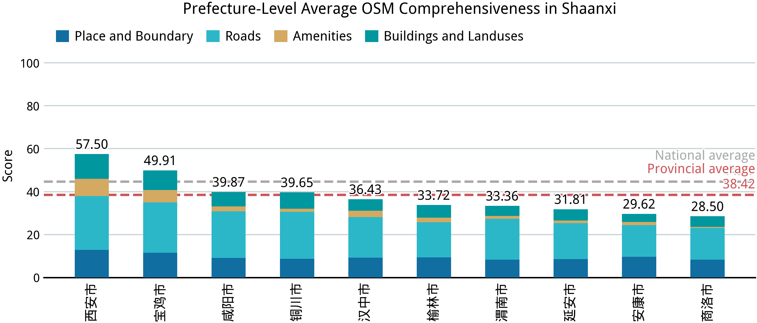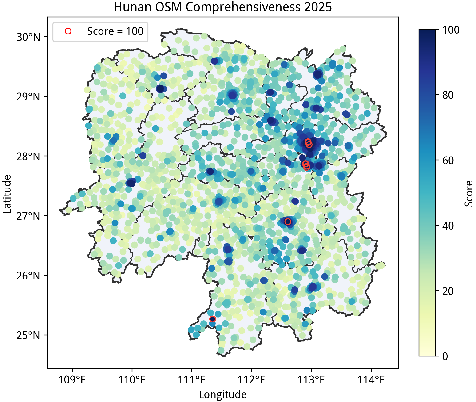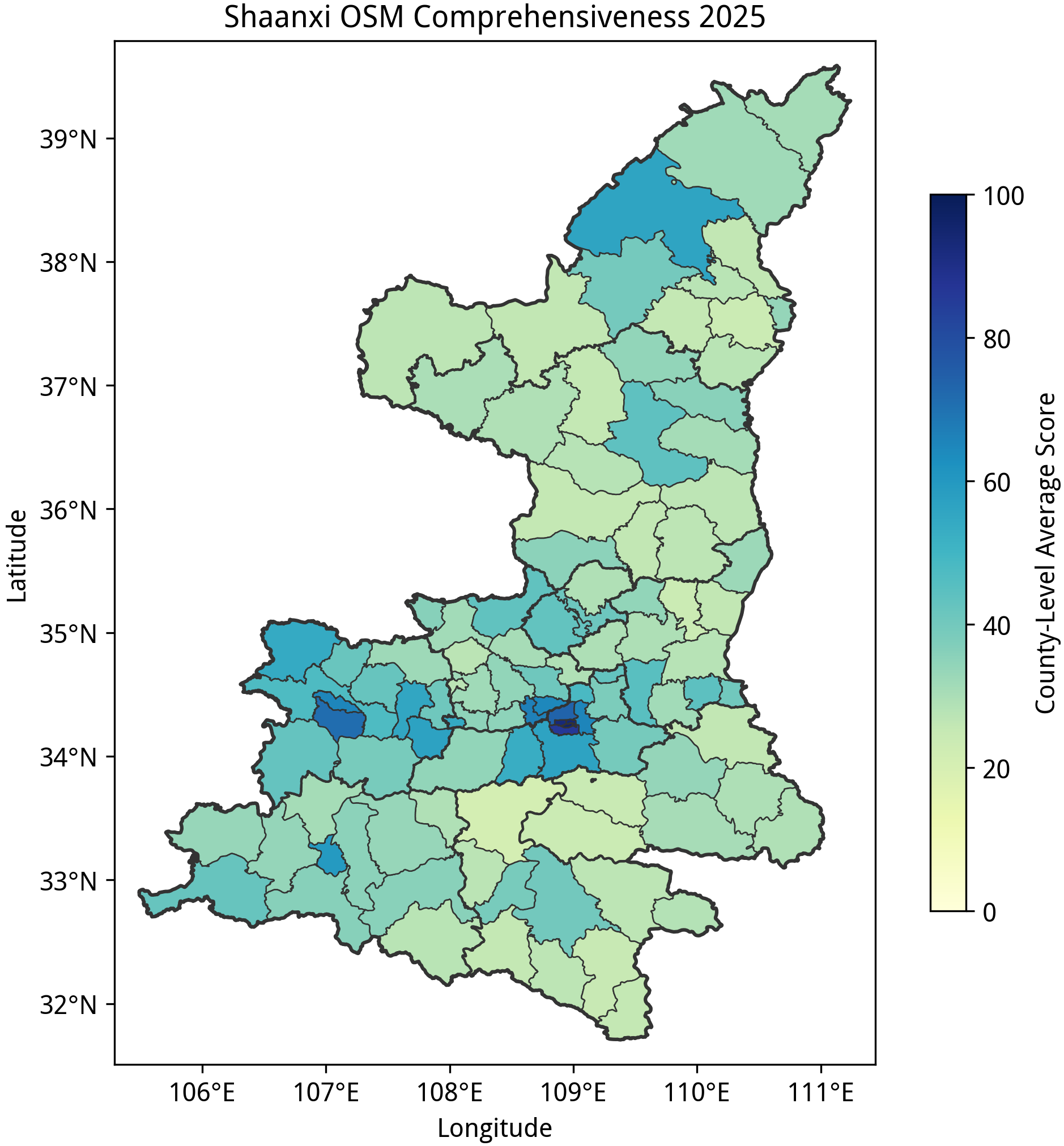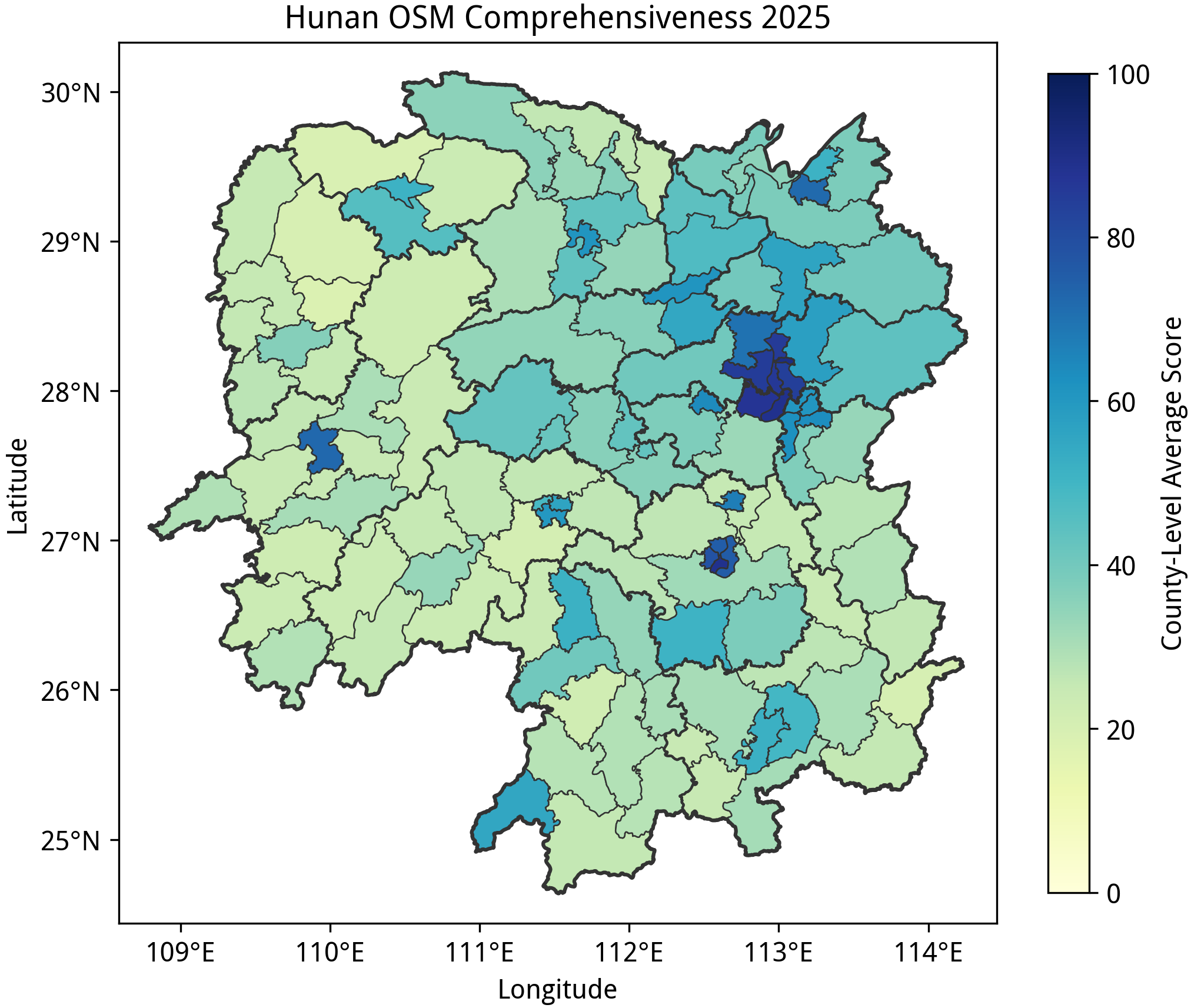 到第五部分,这里的三个省份可以说全省大部分地区都是空白。湖南、陕西两省的平均完备度虽然相似,但分数的分布模式有区别:湖南的分数分布更两级分化,长湘潭地区有不少完备度达到 100 的乡级行政单位(虽然绘图质量风评一般),但湘西州位列全国地级市平均完备度的倒数第一;陕西的分数分布相对稍微均匀一些,西安到宝鸡一带的乡镇完备度较高,需要补充的的乡镇多在黄土高原和秦岭一带。