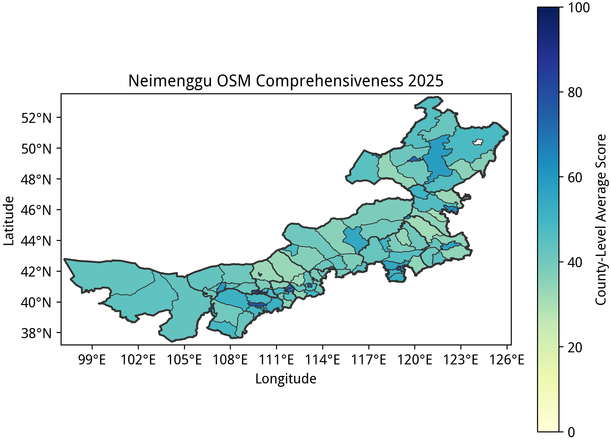 内蒙古自治区排名第 7,平均完备度为 49.33,位居分数密集段的头部。内蒙古中部临近陕西、山西一带,以及东北部的呼伦贝尔市一带的乡镇都有不错的完备度。同时,其乡级行政单位的数量较少,仅 1022 个,使草原、戈壁上相对空白的地区没有太过拉低平均水平。